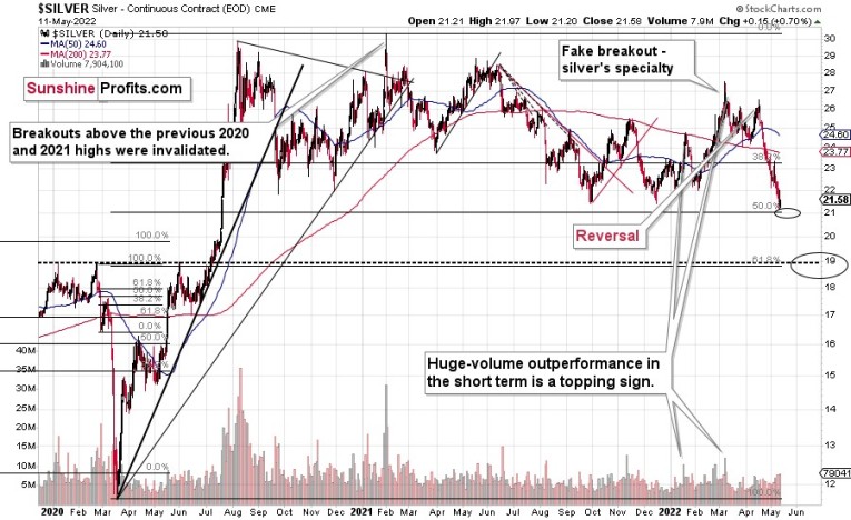 Please note that despite all the “peak silver”, “silver is manipulated so it has to rally”, and “silver shortage” theories, the white metal is now much lower than it was when it got really popular – in early 2021. Don’t get me wrong: I think that the silver price will move into the three digits, but I would like to emphasize that just because something is likely to happen eventually doesn’t mean that it has to happen right away.