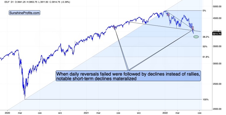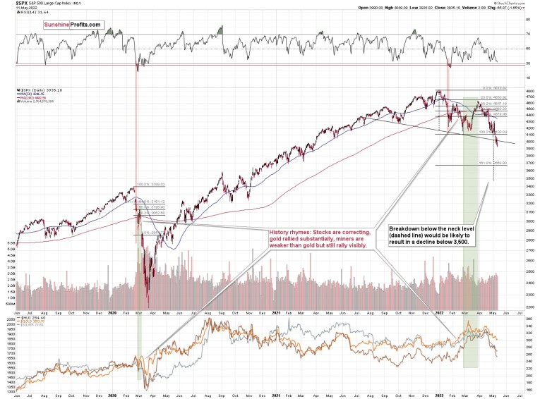 At the moment of writing these words, stocks are once again trying to rally, but so far the rally is not as big as yesterday’s pre-market rally that was just erased. Thus, I doubt that stocks will be able to avoid falling in the near term.