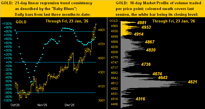 Looking at Gold’s way, ’tis obviously been “up, up and away!”  Below on the left we’ve price’s daily bars from three months ago-to-date along with the baby blue dots depicting the day-to-day consistency of the regression trend:  “Follow the Blues” indeed.  And below on the right is the yellow metal’s 10-day Market Profile with selected price labels for volume-dominance.  As for Gold’s “textbook technicals” (our cocktail of Relative Strength, Stochastics and John Bollinger’s Bands), price is nine consecutive trading days “overbought” irrespective of the separately-calculated overvaluations depicted in the opening Gold Scoreboard: