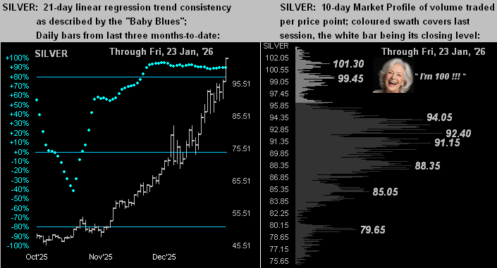 Sister Silver meanwhile owns the title of “Overbought” given her “textbook technicals” are now 49 consecutive trading days as such.  And below (at left), her daily bars and “Baby Blues” are practically upside perfection, as in her Market Profile (at right) she’s lookin’ great at 100!  “Brava Brava Sista Silva!”