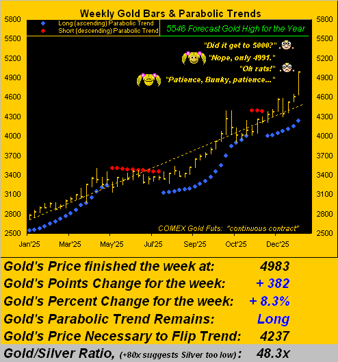 Today at 4983, Gold is +746 points above the chart’s rightmost blue parabolic Long dot at 4237, the hoovering of which in the ensuing week would flip the trend from Long to Short.  Given Gold’s expected weekly trading range is now 206 points, such flip is well out of range.  And toward reaching the 5000 milestone as early as Monday, (barring a severe gap down at the open), a mere +17 points from here is no more than trading noise, (Gold’s expected daily trading range per the website now being 101 points):