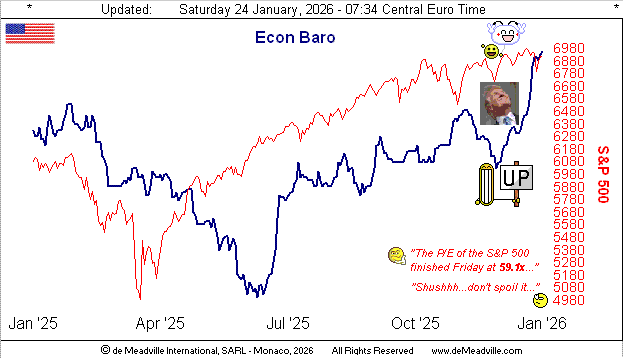 Looking StateSide, the Economic Barometer continues to gain traction.  ‘Course, last week’s World Economic Forum featured President Trump, of whom we apolitically say, seemed to oversell the USA.  A point thereto is in regard to (paraphrased) “inflation has come way down”.  We’re not convinced.  Remember as a consequence of the government “shutdown” there were at one point nearly 50 metrics missing from the Econ Baro; and whilst not all shall ever be known, the inclusive missing count has since been reduced to just 15.