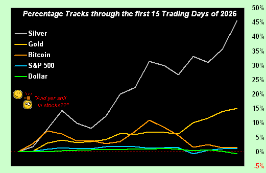 Into the new week, ’tis time for Gold 5000, (again barring “The Sell”).  Gold has begun 2026 with a bang, indeed its best opening 15 trading days by percentage gain of any year so far this century, (which for you WestPalmBeachers down there is since 01 January 2001).  And certainly the same (understatement) can be said for Silver, her having thus far gone nuclear!  Regardless of what can be deemed as too far too quickly — especially with respect to overvaluation — we close with this graphic of the early year-to-date percentage tracks for each of Silver (+46%), Gold (+15%), Bitcoin (+1%), S&P 500 (+1%) and the Dollar Index (-1%):