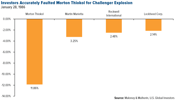 One of these names, however, was hit the hardest—Thiokol. By the end of the trading day, it was down almost 12 percent, more than six standard deviations in the three months before the explosion, according to economists Michael Maloney and Harold Mulherin. What the market seemed to be saying is that Thiokol was to blame.