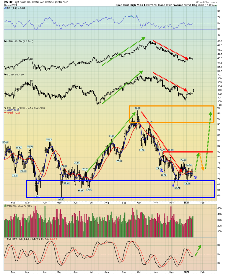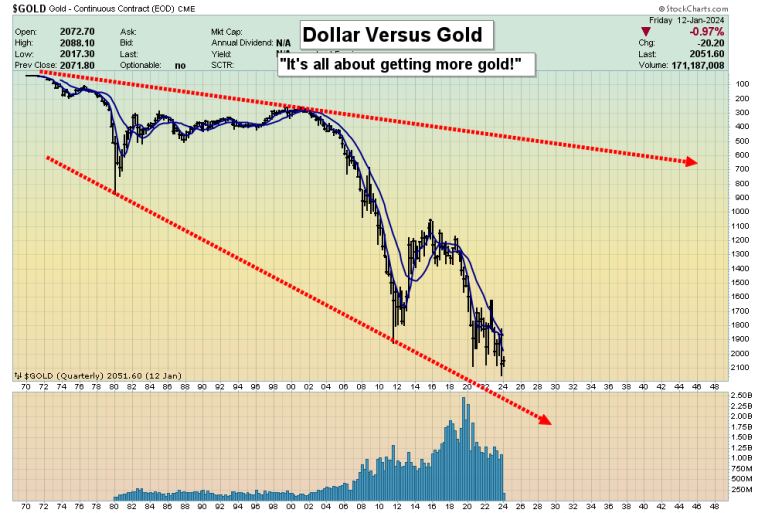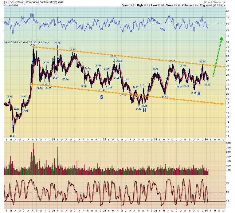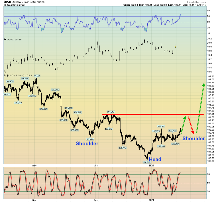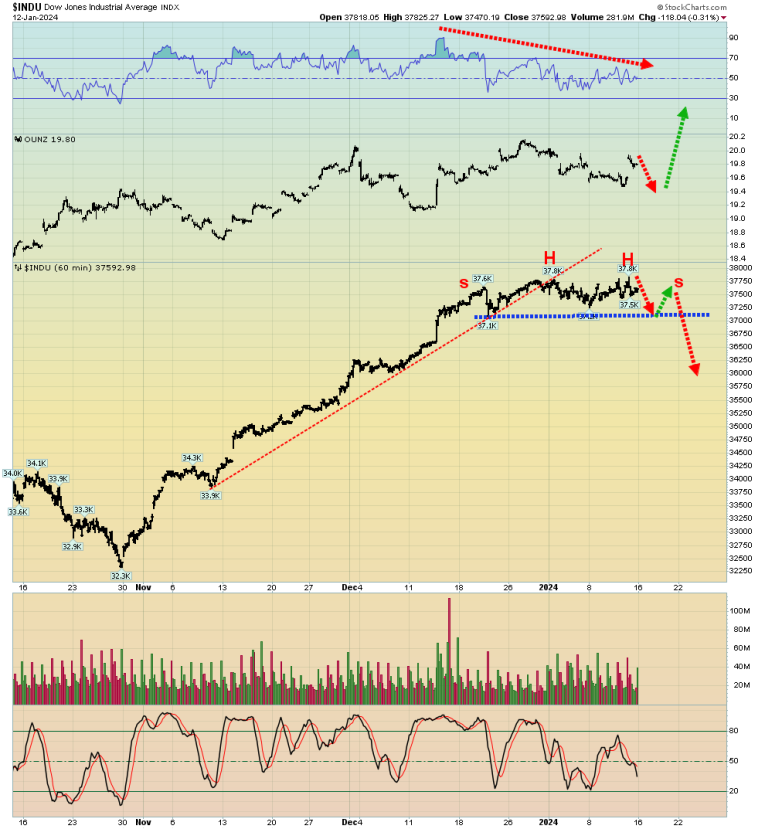 The good news is that the hideous charade may be coming to an end. There’s a potential double-headed H&S top on the Dow and the first week of 2024 trading was negative. That’s an ominous sign for the year!