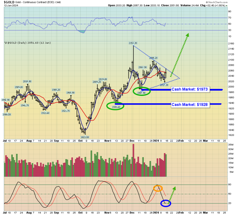 Double-click to enlarge this weekly gold futures chart. It can be argued that gold has successfully broken out above the key $2000 round number zone and is consolidating that breakout now.