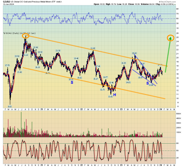 The GOAU ETF looks similar to silver. There have been lots of buy and sell opportunities for both silver bullion and gold stocks within the drift zone, and the next one would be defined by a gold price sale into $1973.