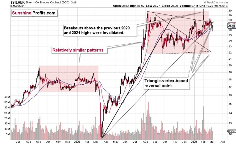I previously wrote that silver is likely to catch up with the decline at its later stage, while miners are likely to lead the way. That’s exactly what we’ve been seeing in the last few months. Silver is still likely to catch up with the declines when silver investors panic – just as they tend to do close to the end of given price moves (selling close to the bottom and buying close to the top). So far, miners remain the asset of choice for trading, but sometime during the next downswing, we might move to silver in order to magnify gains from both declines. As a reminder, please consider what happened on March 13 and March 16, 2020 and consider that the GDX ETF bottomed (in terms of the daily closing prices) on March 13. That was when silver was only in the middle of its decline.