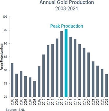Gold available for purchase is in finite supply. At a fairly consistent production rate of around 2%/year (and falling), gold is unlikely to experience a "production spike" like a base metal might.