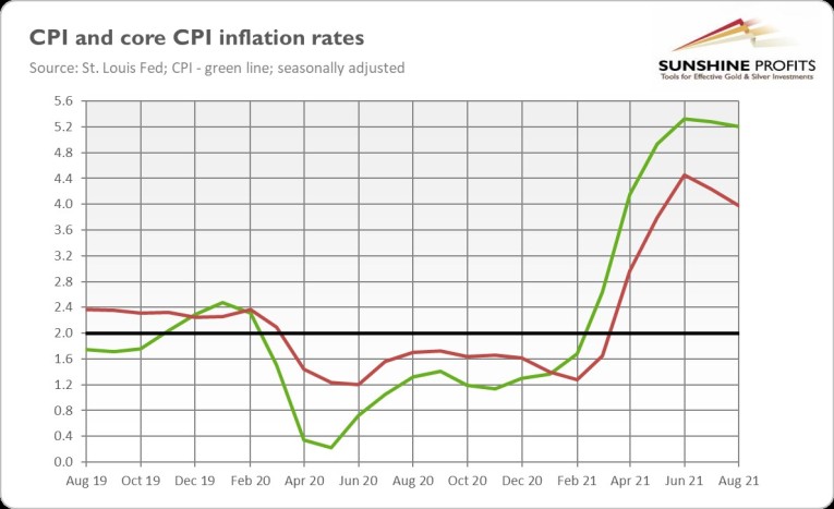 What does the August report on the CPI imply for the gold market? Well, theoretically, softer inflation should be negative for assets sensitive to inflation such as gold. The yellow metal is seen as an inflation hedge, but the data says that it shines when inflation is high and accelerating. So, the deceleration should be bad news for gold.