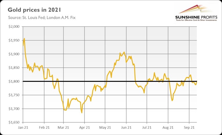 However, as the chart below shows, the price of gold has increased after the publication of the inflation report, jumping again above $1,800. Just as one month ago, slightly softer inflation has offered some hopes that inflation would prove to be transitory, in line with Powell’s narrative, and provide the Fed with an excuse to continue its ultra-dovish monetary policy. Indeed, according to the CME FedWatch Tool, the expectations for the Fed’s tightening cycle have diminished slightly from the previous week. For instance, the odds for the interest rate hike in December 2022 have declined from 54% to 50%, so it’s a coin toss. The softening of these expectations has supported gold prices.