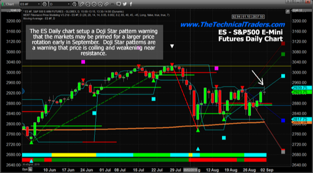 This YM Daily chart shows a similar pattern – another Doji Star setup. The Doji pattern sets up right at a key resistance level, near 26,400, and aligns with other chart and patterns to warn that price may weaken into a strong Candlestick reversal pattern. All it would take is for the price to move below 26,000 and begin a new downside leg.