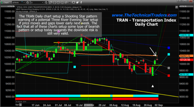 The Doji Star and Shooting Star Japanese Candlestick patterns are part of a unique group that identifies potential price reversals, support/resistance and can often build into other types of patterns. Our belief is these setups in the current chart will eventually create an Evening Star formation with a downside price move early next week. This type of pattern would confirm resistance near the body of the current Doji or Shooting Star candlestick and also confirm our analysis that a price breakdown should continue.