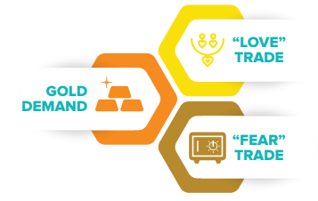 The first driver is what we call the Love Trade, which describes the practice of purchasing gold as gifts for loved ones during holidays and festivals. Such gift giving is especially prominent in India and China. The other driver is the Fear Trade, which describes purchasing gold out of fear of war or concern over government policies. This group primarily sees gold as a store of value during hard times, rather than an expression of affection.