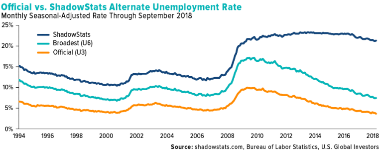 The figures closely followed one another from 1994 through 2009. Then, in 2010, Williams’ ShadowStats unemployment rate decoupled from the U3 and U6. Although the BLS’ rates have trended significantly downward since then, ShadowStats’ data states that the unemployment rate is actually 21.30 percent as of September 2018.