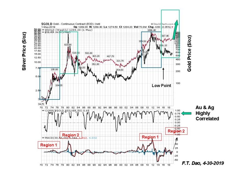 The Gold price and the Silver price are highly correlated (+0.65) over a period of 50 years.  Our earlier Fourier cycle analysis had identified similar patterns as shown in the chart labeled Region 1 and Region 2.