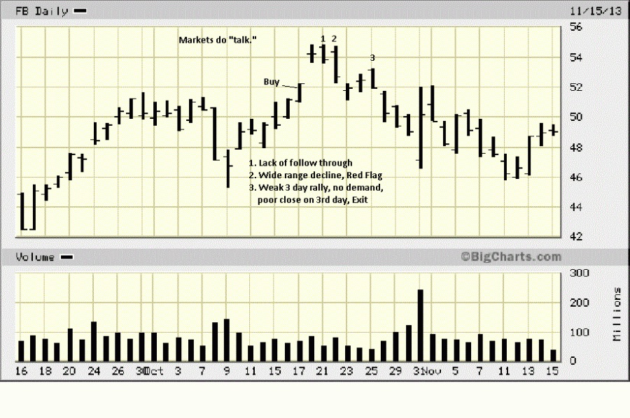 At 1, there is a lack of follow-through on a small range day. Not a big deal. At 2, we see a wide range bar to the downside on increased volume and a poor close. This is another Red Flag message, an immediate alert that the stock is not acting well, especially when the overall market is trending higher.