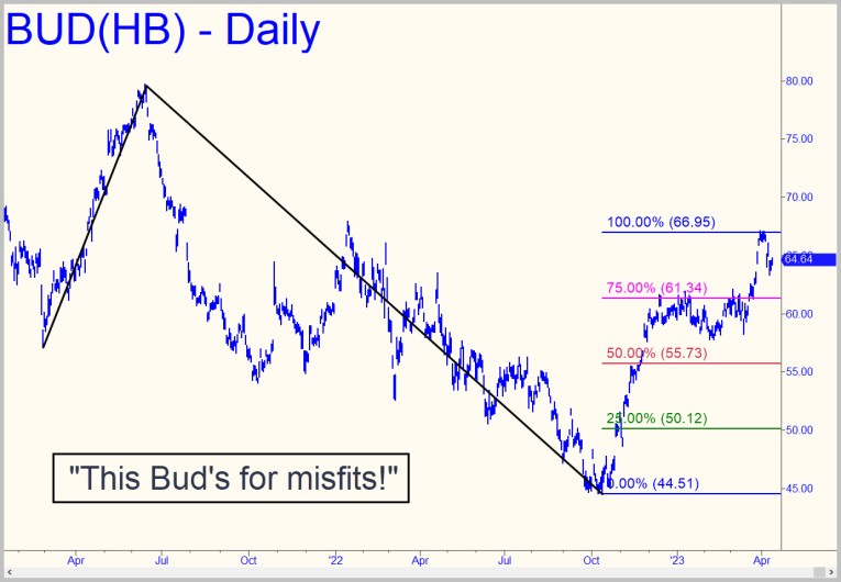 But I digress. Concerning price action in Budweiser shares, the ostensible subject of this commentary, two weeks ago I’d have made BUD an even bet to test highs near 80 recorded in June 2021. However, the fact that the stock topped precisely at the 66.95 ‘Hidden Pivot’ target shown in the chart warrants a yellow flag as long as Mulvaney has breath enough to flounce, vamp and embarrass the nation. BUD surpassed some prior peaks before reaching the target, and that is bullish. If the unthinkable happens and Heinerscheid’s outrageous gamble produces higher sales for Bud Light, then America is in far worse shape than I had imagined.