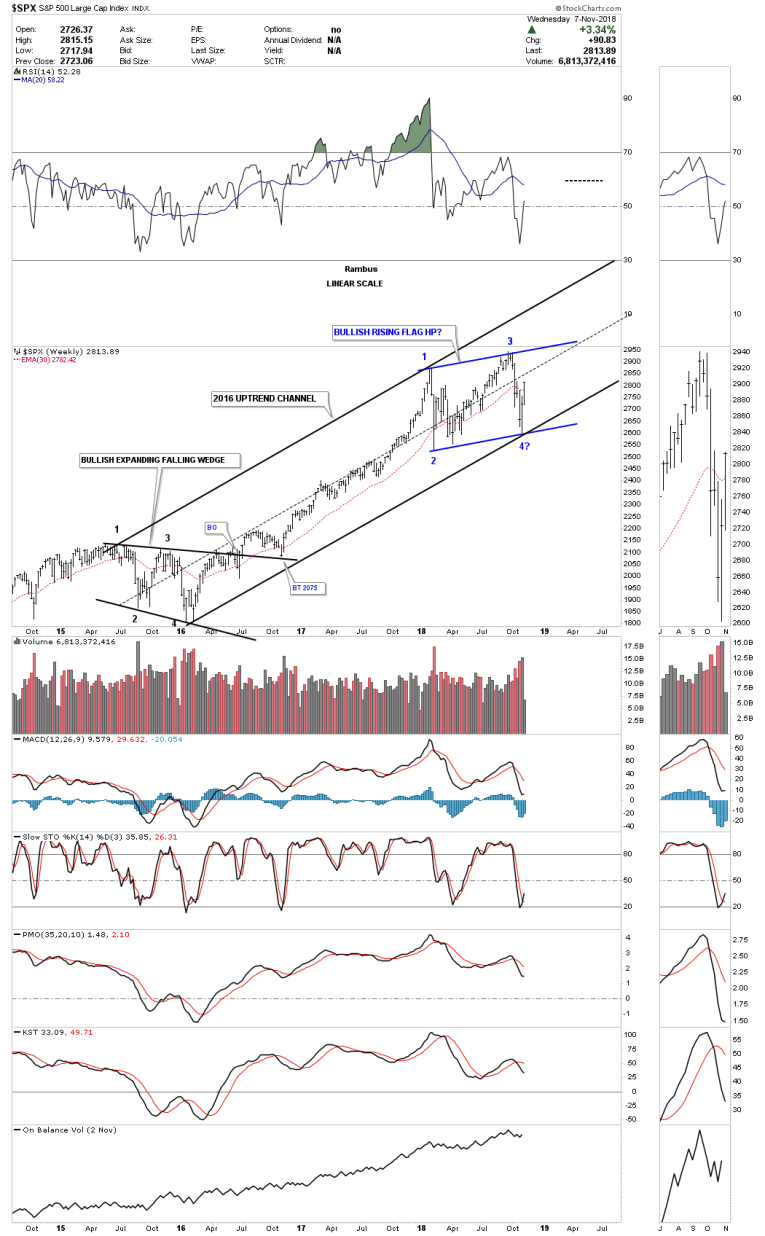 This next weekly chart shows the now rising flag formation is 3/4’s the way finished if we end up with four reversal points. What is also encouraging about this pattern is that it’s slopping up in the uptrend trend channel which shows a strong bull market is still in play. One last positive on this chart is the SPX is now trading back above its 30 week ema.