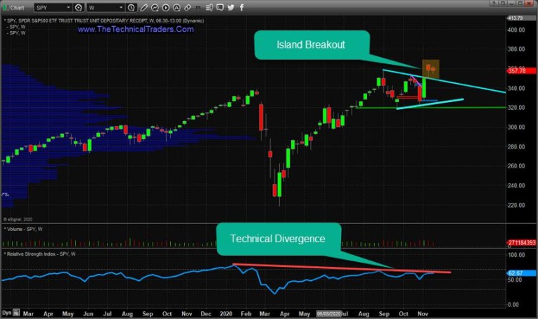 My researchers and I want to highlight a Weekly chart pattern that is warning of a potential Top/Reversal in the SPY & SPX. Although the current trend is Bullish and the markets are looking forward to the new year, new policies, and probably new stimulus which normally prompts some type of upward price rally in the markets, we see an “Island Setup” that has continued to form after all the positive COVID-19 vaccine news.