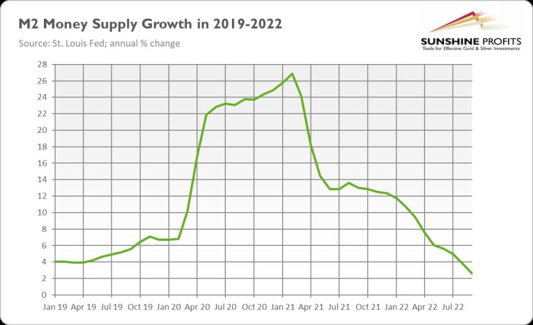 Well, as always, there is some truth in these opinions. The inflation rate is likely to decrease as the growth in the money supply decelerates and even declines below the pre-pandemic rates (see the chart below). And monetary policy operates with a long lag, which means that the effects of the hawkish Fed’s actions haven’t been fully felt by the economy. Hence, the central bankers could easily overdo. After all, they are so incompetent that overreacting to inflation after a long period of underreactin wouldn’t be surprising at all.