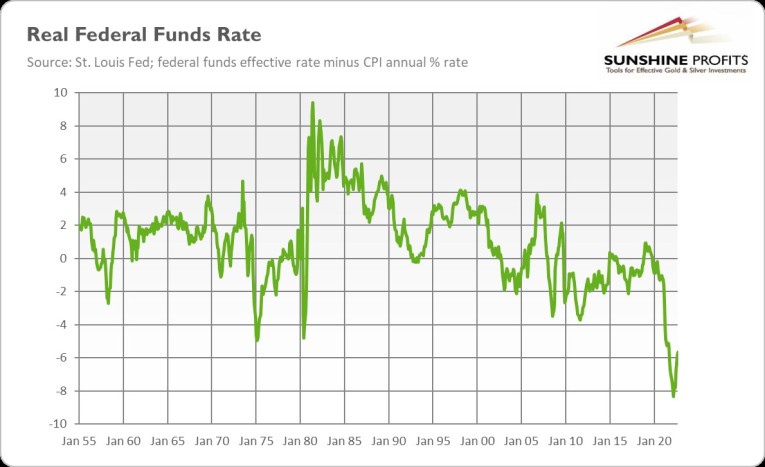 What does it all mean for the gold market? Well, the truth is that the Fed is still conducting too easy, not too tight, monetary policy. The lending conditions have tightened, but this is because the financial sector has been cautious and forward-looking, not because the US central bank has become restrictive. We’re moving into this territory, but very slowly.
