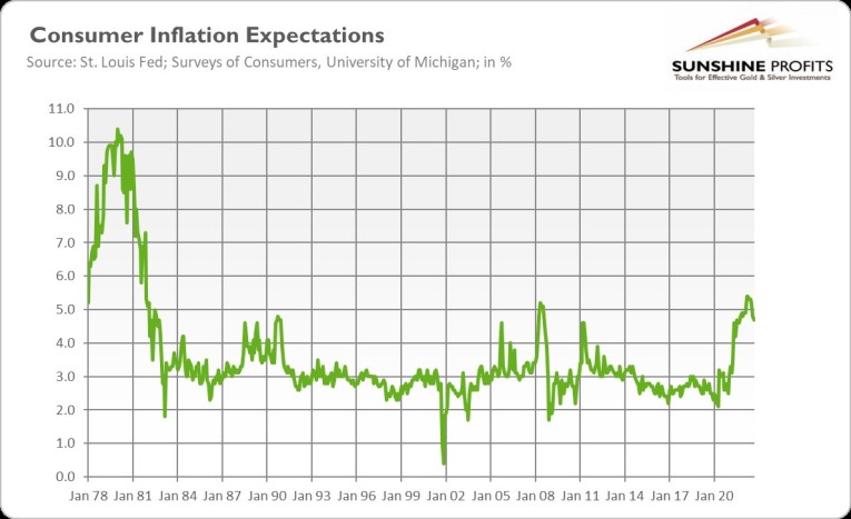 That’s excellent news for the gold bulls, as stagflation is what gold likes best. This is because during stagflation, we have both economic stagnation and high inflation. When attacked by two enemies at the same time, most assets become vulnerable, and gold tends to outperform them. This is not surprising, as during stagflation there is a huge amount of economic uncertainty, confidence in the central bank is low, and real interest rates are on the decline, with some of them falling into negative territory. In other words, stagflation makes gold’s fundamental factors bullish.