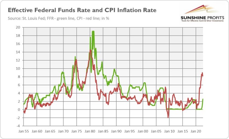 To be clear, it’s possible that inflation will decline and we’ll avoid stagflation or that the Fed will blink and prevent the debt crisis instead of fighting with inflation at all costs, but one or another economic crisis is going to happen. When gold smells it, it should rebound! 2023 should, therefore, be much better for gold than this year, as the economy will be approaching recession and the Fed will be less hawkish.