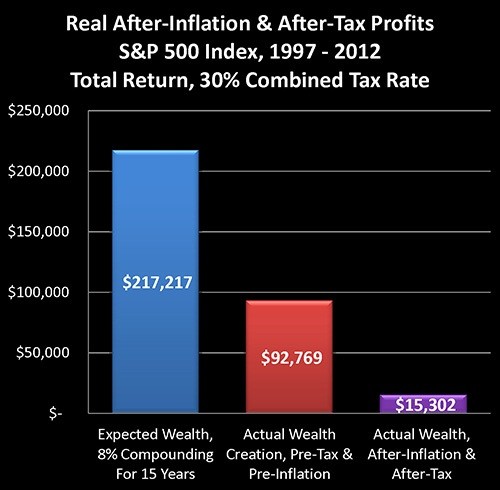 The purple bar shows what really matters – the purchasing power of average stock market investments on an after-tax and after-inflation basis. As shown above, in the real world for many millions of investors, the purchasing power of long term stock market profits has been virtually non-existent. If we compare what really matters – which is what money will buy for us on an after-tax basis – then real gains are a mere 7% of expected wealth gains.