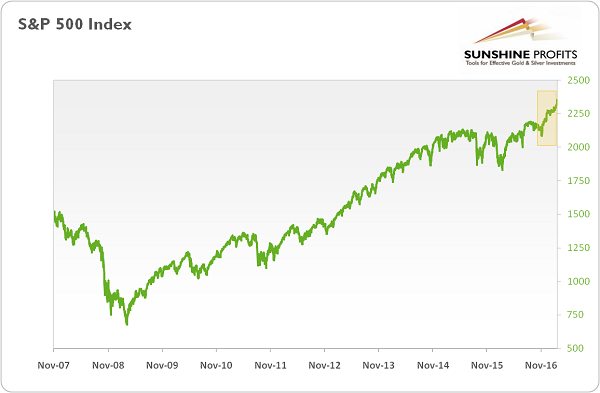 In January, the Dow Jones Industrial Average broke above the symbolic 20,000 for the first time ever. This development raised again concerns about the condition of the U.S. stock market – further gains could be a headwind for the gold market, but the end of the bull market would support the yellow metal. The valuations were at record highs even before the presidential elections, but Trump’s rally elevated them further, as the chart below shows.