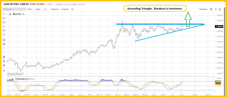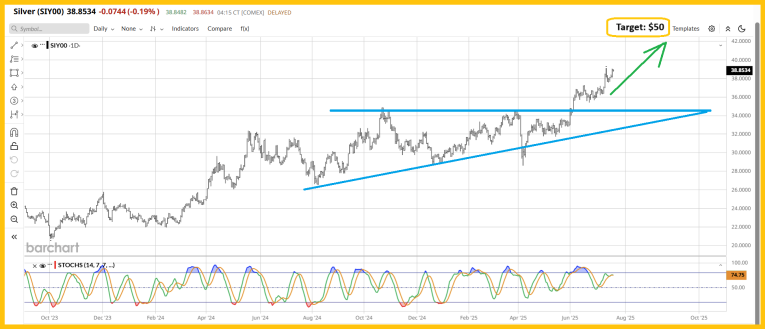 The triangle target is $3800 and if it plays out silver should challenge its all-time highs at about $50.