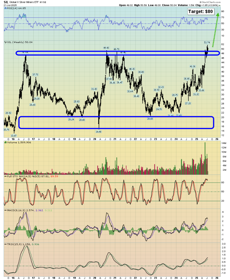 This is the stunning SIL chart. Silver stocks are breaking out of a massive 10year trading range. Basis the SIL ETF, the target is at least $80, and given the size of the range trade, a surge to $100 is likely! The bottom line: Good gold times and great silver times are here!