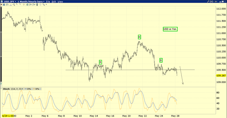 This is the dollar versus yen chart. The dollar looks terrible and a new leg lower seems imminent.