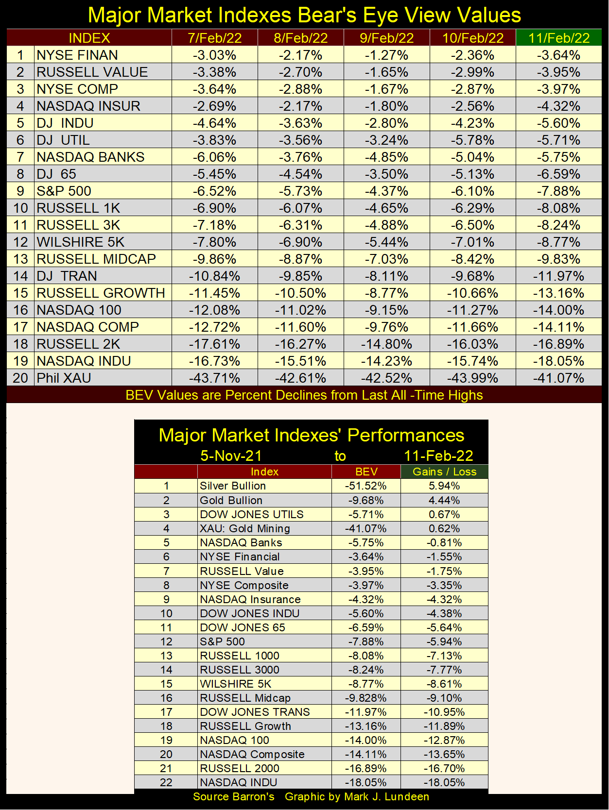 Here's my Major Market Index BEV Value Table. It’s been a few weeks since we’ve seen a BEV Zero in the table below (0.00% / New All-time High). On Wednesday, eleven indexes closed in scoring position (within 5% of an all-time high). But by the close of the week on Friday, only four of these indexes managed to close in scoring position. As we move ever deeper into 2022, I detect growing weakness in the stock market. This is the type of situation where out of the blue, a big market event to the downside can catch most by surprise.