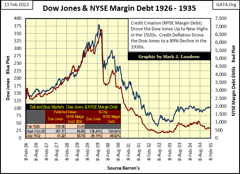 Next is a chart for the Dow Jones and NYSE margin debt from 1926 to 1935. During the 1920s, Wall Street allowed their margined clients to put down ten cents for every dollar of stock purchased on margin. Knowing that, it’s easy understanding why the increase in margin debt during the 1920s bull market fueled the advances for the Dow Jones, and why the liquidation of margin debt led to an 89% collapse in the valuation of Dow Jones in July 1932.