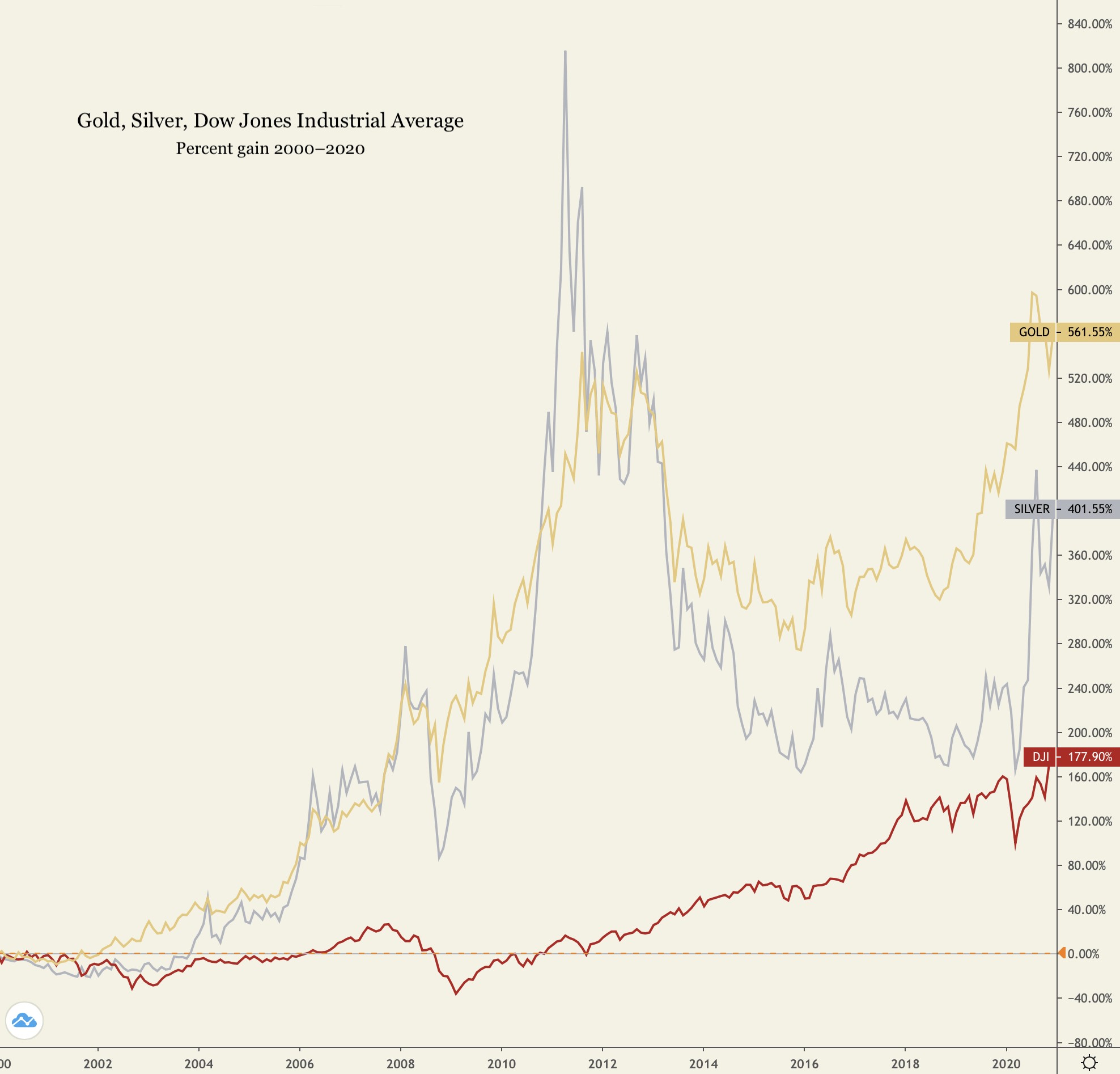 Since the beginning of gold’s secular bull market in the early 2000s, we have recommended an unambiguous course of action: Own the physical metal – fully paid for and stored nearby – then sit back and watch the show. Those two courses of action have paid handsome dividends over the years, both in terms of peace of mind and a healthier balance sheet. In fact, for some, that prescription has created significant wealth. Since the turn of the century, gold is up 562%; silver, for its part, is right at 402%. By way of comparison, the Dow Jones Industrial Average is up a meager 178% over the 20-year period. The precious metals have preserved wealth over the past tumultuous two decades while other, often more complicated courses of action, have fallen short. (Taking a longer view, since 1971 – the year the United States severed the tie between gold and the dollar – gold is up 4460%; silver is up 1524%, and the Dow is up 3250%.)