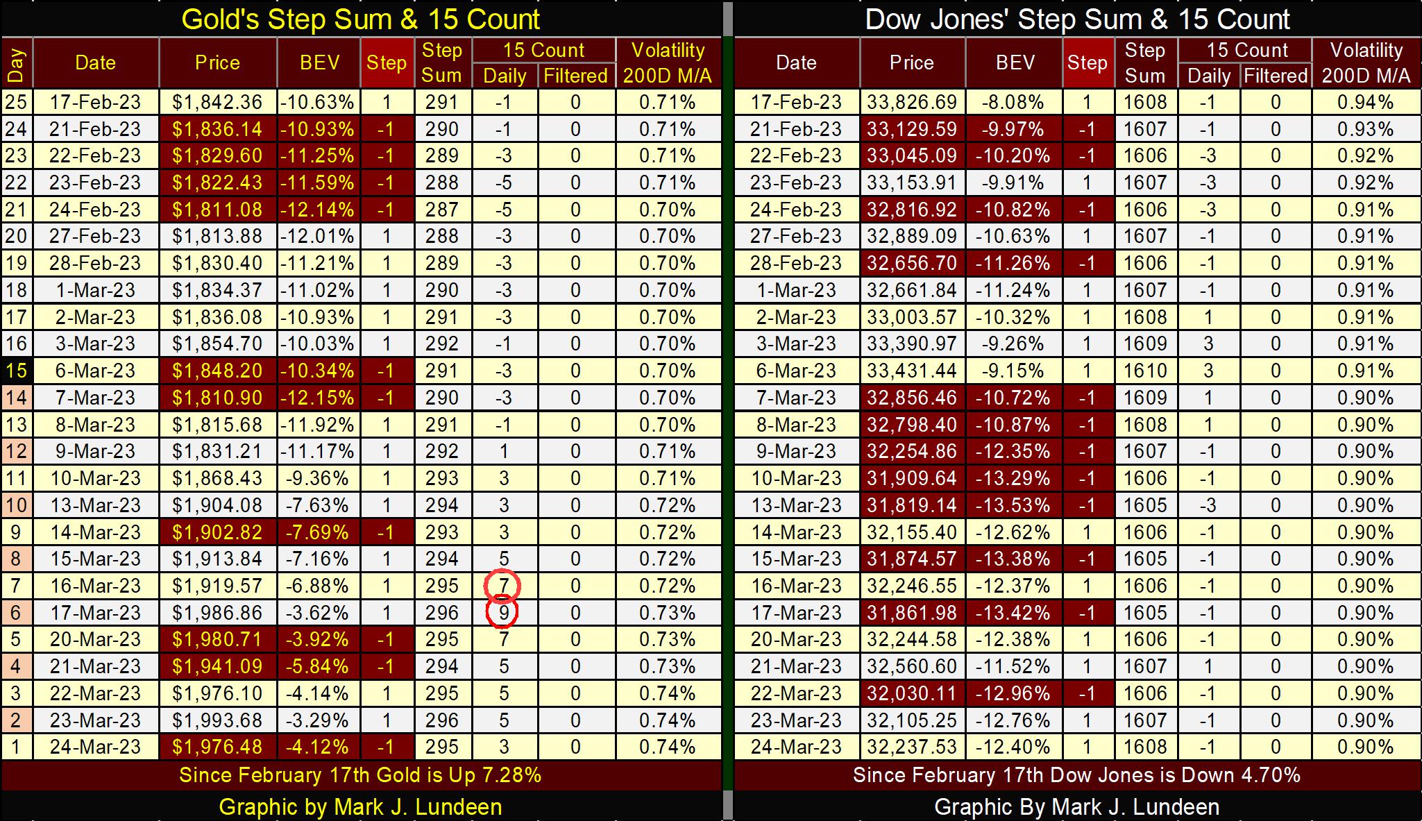Gold also became overbought last week, with a 15-count of +7 & +9. Markets don’t like being overbought, and tend to sell off when they do. Now look at gold’s trading last week. It closed lower for three out of five trading sessions. Yet on Thursday, gold still closed higher than on Friday, March 17th. It seems gold wants to go up, and make some market history in the days and weeks to come.