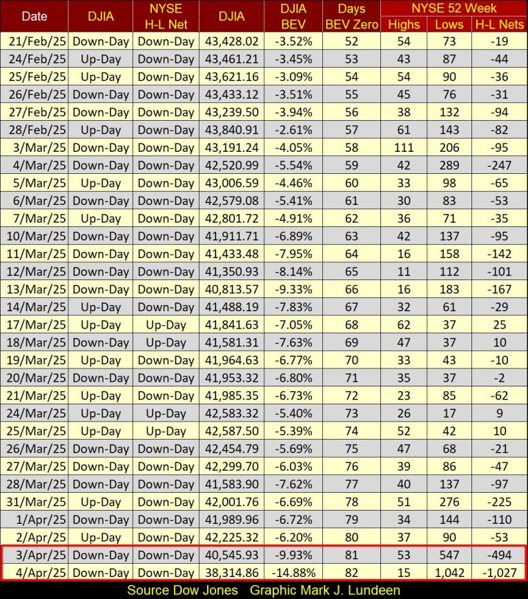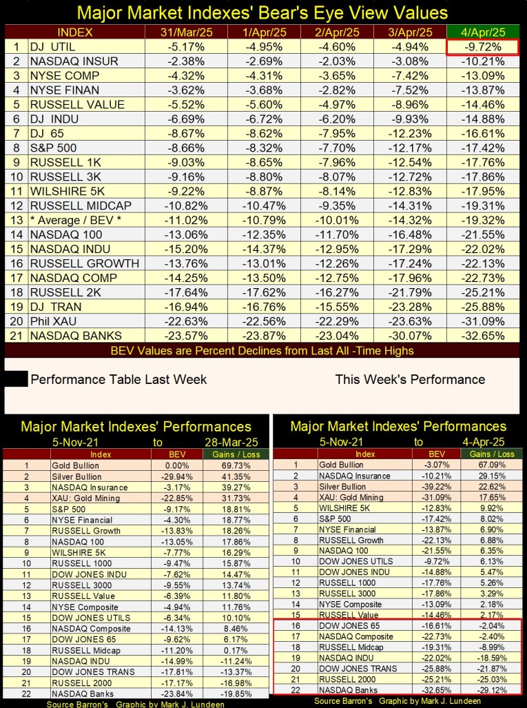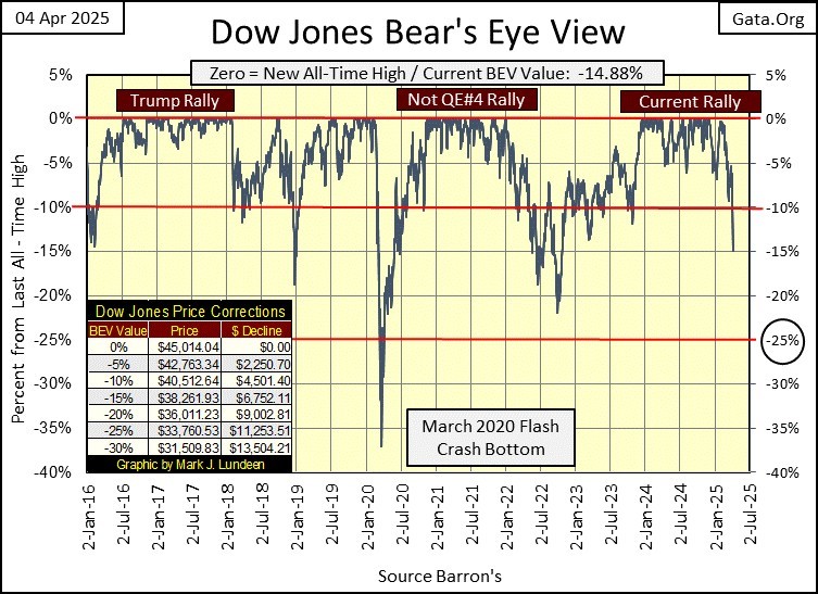 Okay, I got that out of my system, and now onto this week’s Bear’s Eye View (BEV) chart for the Dow Jones. Yikes! This week, the Dow Jones collapsed below its BEV -10% line, and almost closed below its BEV -15% line. This is something the Dow Jones didn’t do for Pearl Harbor; a two day, 9.26% decline from Wednesday’s close, and we can expect more deflation, and tariffs scares to follow.