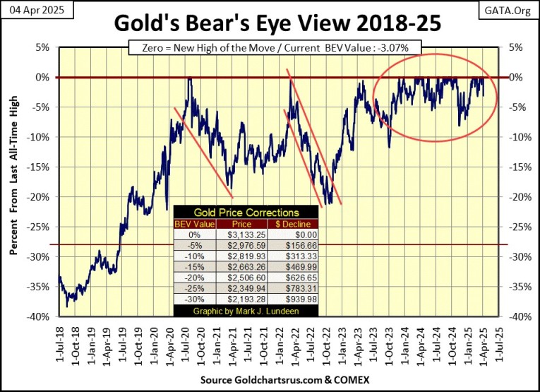 Now on to gold’s BEV chart. Not much to say, except gold’s market advance, which entered scoring position in November 2023 (daily kept within its BEV 0.00% and -5% lines), remains intact.