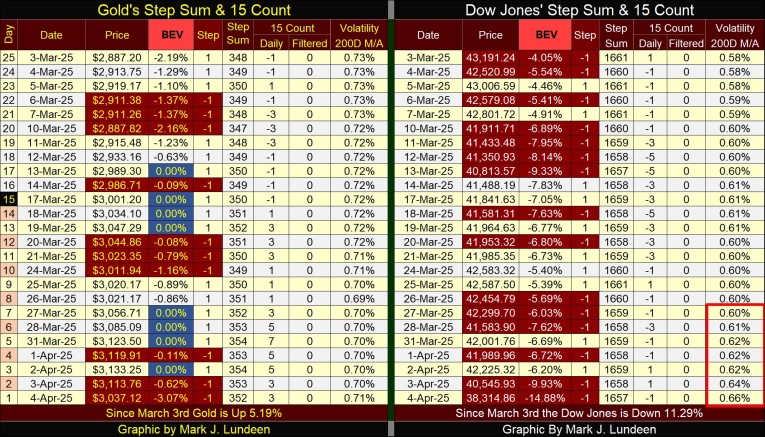 Looking at gold’s step sum table below, it looks good. Its 15-count closed the week with a +3, down nicely from the overbought +7 from last week’s close. Look at all the new BEV Zeros since early March, seven of them, with two of them this week.