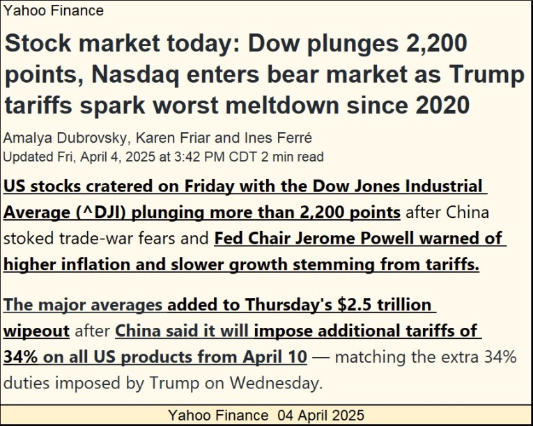 Some “market experts” reported the fact, that Thursday’s 1,679-point plunge in the Dow Jones,’ was its 5th largest daily decline in history. Or, was until Friday’s 2,231-point plunge. Geeze Louise, what kind of maniac does the United States have for a President?
