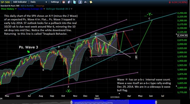 The chart below shows a more micro look at the chart. I also adjusted the expected b wave bull flag into an expanded irr. flat, which projects down to near SPX 1958/60 by April 20. There is an adjusted 10/20 wk cycle (that is a mirror of what happened last year prior to the Oct 2014 drop, which also made trading for me a lot more difficult in 2014) due between February 2, 2015 and April 20, 2015. Ideally, we should see a final top on June 3, 2015 near SPX 2200 (max) and a drop to under 1670 by around June 29 (I may need to change these dates and prices slightly as we get closer).