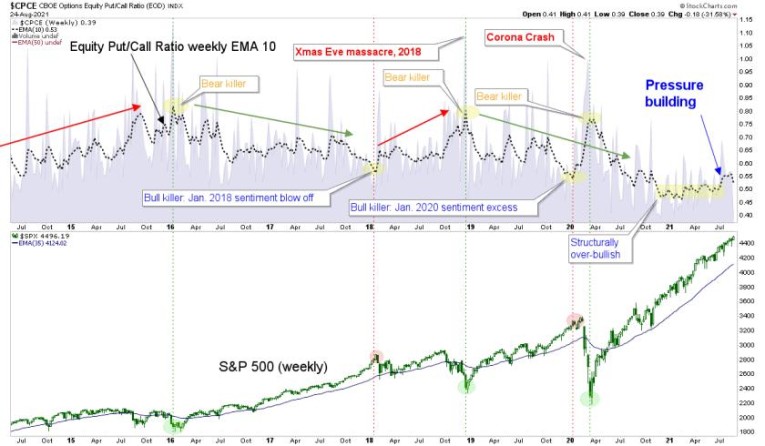 Risk? Well, when SPX took out the previous 2020 high last summer we established a target of 4400 (conservative) to 4600 (at an extreme). The market is in the target zone, CPCE has begun to labor up and out of the structurally over-bullish floor and well, it could be a signal of a latter stage bull market. But a warning about jumping into a heavily active bearish position is that using the run up to 2016 as an example, the pressure can build for months, even years before risk is realized. Another caveat to going full frontal bear is that the EMA 10 is starting to hook down again as pressure is being relieved lately.