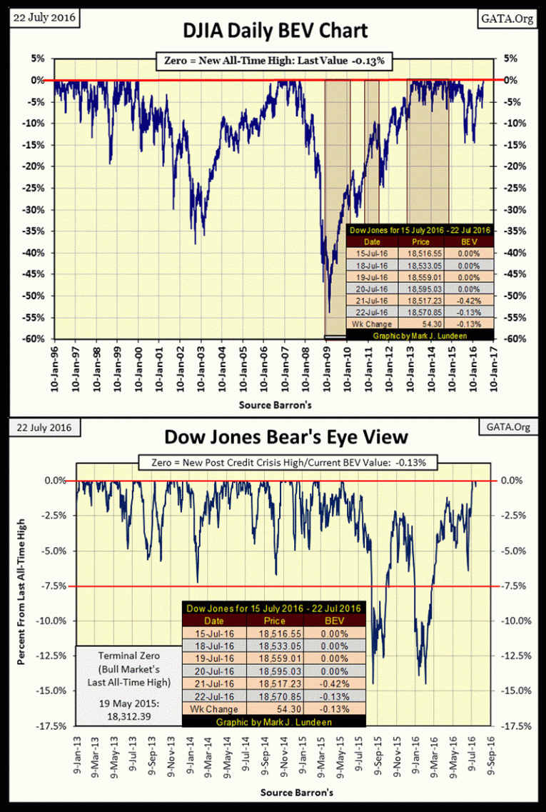 I’ve been away for a few weeks, during which the Dow Jones Index managed to make six consecutive new all-time highs (July 12-20) in the BEV Chart below. It ended the week only 0.13% from making the seventh. I didn’t believe the venerable Dow could do it without a new round of quantitative easing (QE), but it did. In the upper chart of the Dow’s BEV graphic below, the post credit crisis QEs are highlighted, which does much to make my point that the market gains of the past eight years were primarily a monetary event.