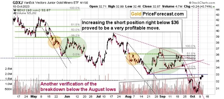 Let’s check the technical situation on the GDXJ’s chart, which serves as a proxy for junior mining stocks. We’re focusing on them, as mining stocks often lead gold and silver prices, so by addressing miners, we can be earlier with regard to indications for the gold market.