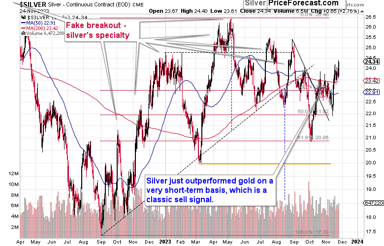 In gold’s case, it’s just another attempt to move above the rising, dashed resistance line that’s parallel to the one connecting the March and October bottoms. The previous attempt to break above this line was invalidated, so it’s likely that it will also fail this time.