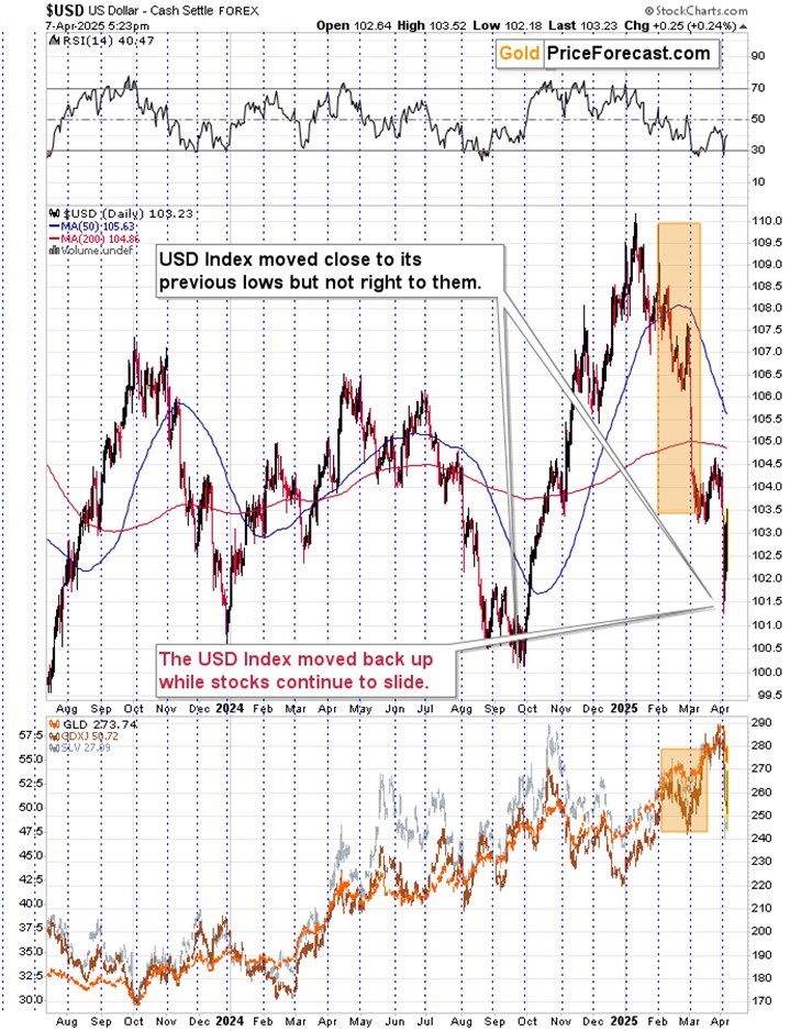 Precisely, I wrote about it on April 3 after both: stocks and the USD Index plunged. In addition to the above, we saw huge declines in: crude oil, copper, silver, and even gold.