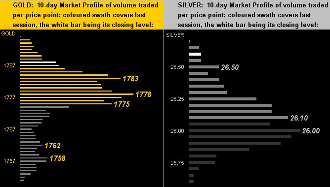 As to near-term pricing, here we've our two-panel display of the 10-day Market Profiles for Gold on the left and Silver on the right. As earlier inferred, despite Gold's weekly parabolic trend having just flipped to Short, its Profile appears price-supportive from 1783 down to 1775. Similarly, Sister Silver looks safe above 26.00:
