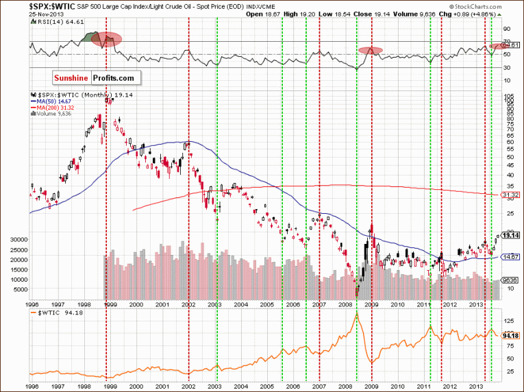 Just like in the oil-stocks-to-oil ratio, the stocks-to-oil ratio’s 2011 high was in tune with the bottom of the corrective move that we saw in crude oil. We noticed similar price action also in May 2013. In both cases, declines in the ratio triggered increses in light crude. What’s interesting, the ratio’s lows corresponded to crude oil highs (marked with the green lines). We saw such situations in 2003, 2005, 2008, 2011 and also in 2013.