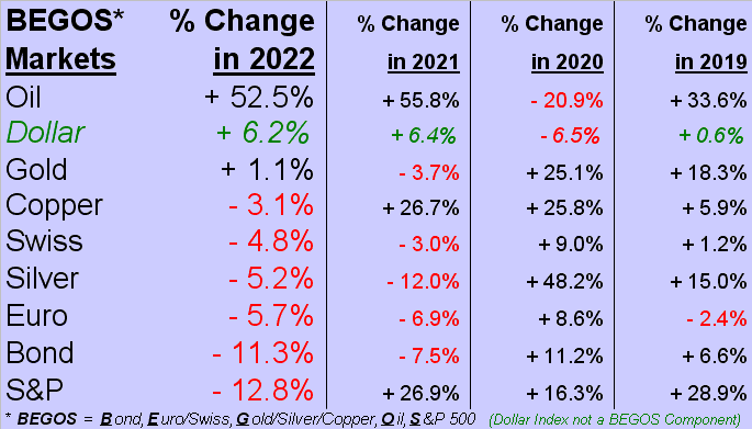 ■ A just-released Fed survey taken late last year (what's the point?) finds Americans to be strongly positioned financially. Not having seen the survey content, we wonder if the results included "marked-to-market" assets. (See the cellar dweller in the aforeshown table of the 2022 BEGOS Markets' performances).
